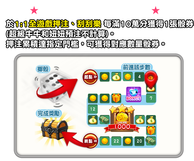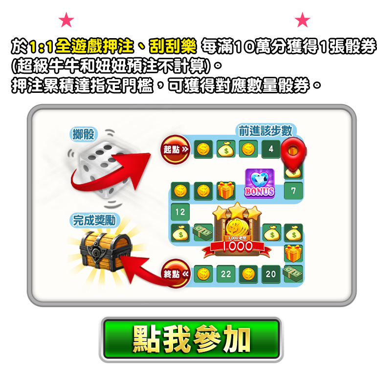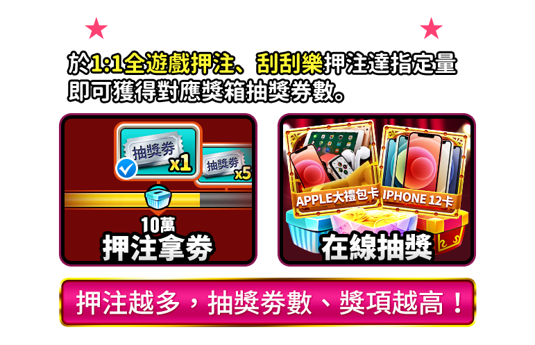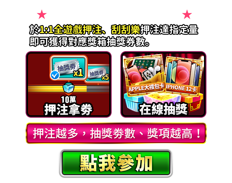 2.豪享抽,天天開獎,首期開獎為2021/05/02(五)20:00,押注採計2021/05/01 00:00起至2021/05/02 19:59;每期累積押注於開獎後清空,且每期抽獎券僅限當期抽獎用。