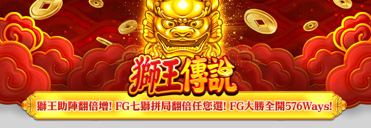 「獅王傳說」是款左帶頭5輪243Ways轉輪遊戲,每局押注依其高低可啟動最高三列的金元寶,觸發獅王再現,讓您贏分再加倍賺更多!另外,遊戲中第一輪從左到右出現3個(含)以上錢幣圖騰,即進入免費遊戲(FG),共有七種局/倍數自己選擇,決定專屬連線贏分加碼外,錢幣再現FG再加局,讓您隨時輕鬆賺大獎!