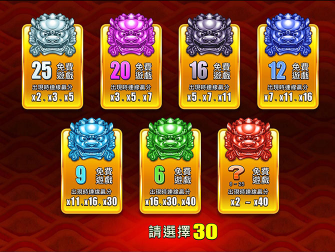 進入免費遊戲(FG)後,有七種不同局/倍數圖像可以選擇,選完後即可進入免費遊戲(FG)。另外,每種局數都有對應的「贏分倍率」,所選的局數越小則對應的贏分倍率就越大。