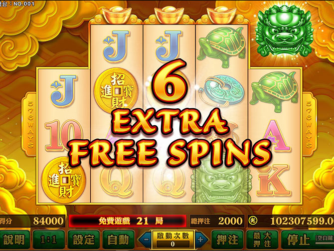 圖騰三連線時,則會依一開始所選的免費遊戲的局數加上,讓您增加新的免費局數;另外,只要在一般遊戲中,您的押注達到最高額度並完全地讓金元寶全啟動後,在進入到免費遊戲(FG)時,也會從243WAYS變成576WAYS!