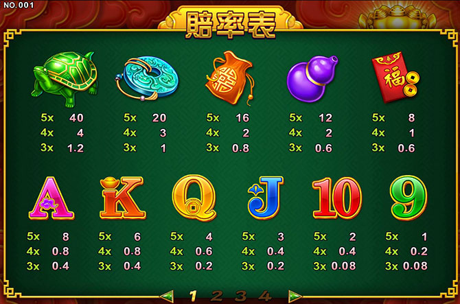 - 得分:由左而右,3個以上連線則中獎。相關賠率請參考賠率表。